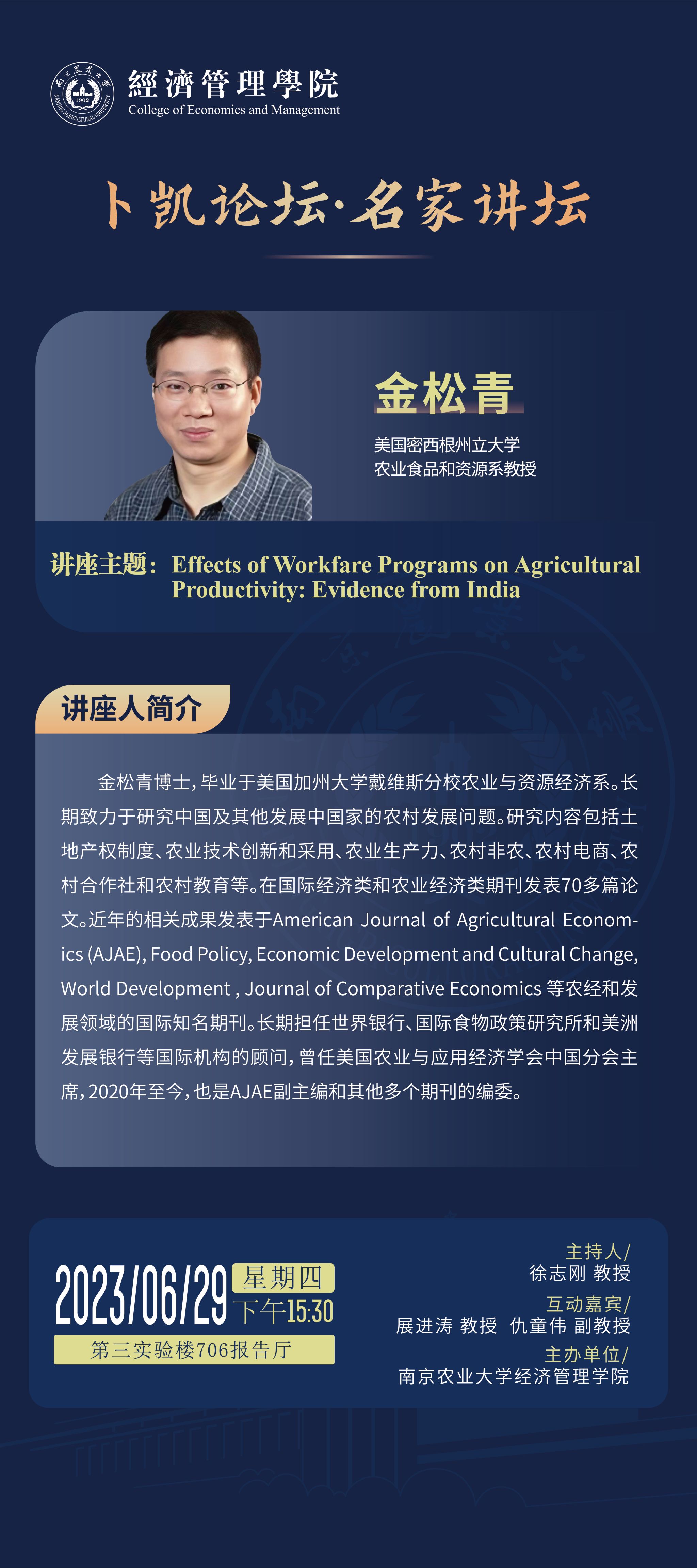 报告人:金松青 美国密西根州立大学农业、食品和资源系教授