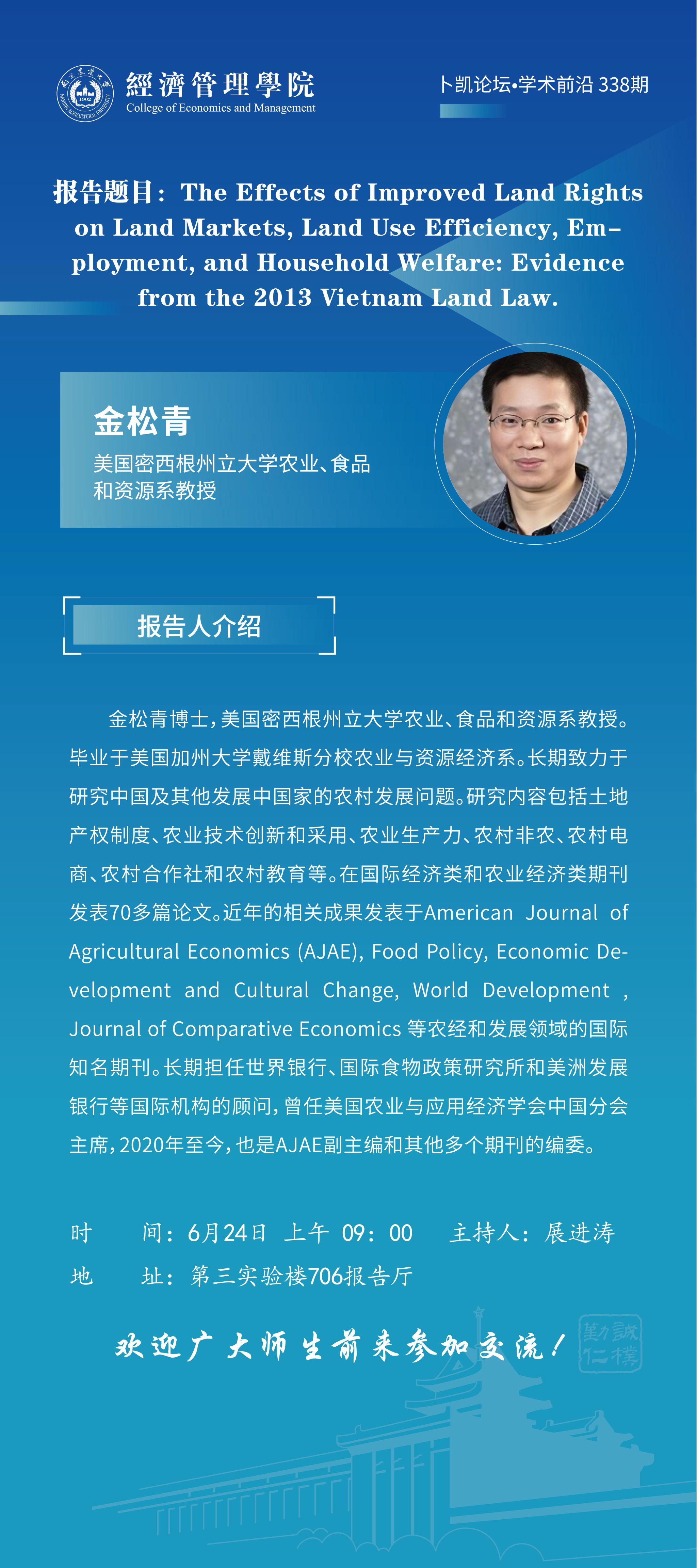 题 目:The Effects of Improved Land Rights on Land Markets, Land Use Efficiency, Employment, and Household Welfare: Evidence from the 2013 Vietnam Land Law.