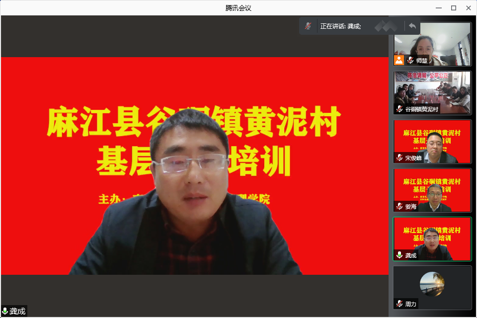 2021年11月10日下午,det365登录网站主页携麻江县谷硐镇黄泥村做基层干部培训交流。优秀校友、盱眙县国家现代农业产业园管理委员会筹建办公室副主任龚成受邀作专题汇报。会议由院党委副书记宋俊峰主持,院党委书记姜海,副院长、党委委员耿献辉,党委委员、经济贸易系教师党支部书记周力参加座谈交流。