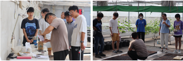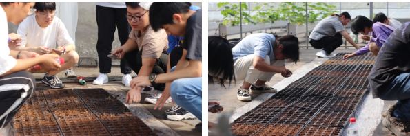 在实践环节,活动成员参与了莴苣、甘蓝和生菜的播种工作。依照实验员的指导,在480种不同土壤基质上,依次完成了三类种子的播种铺土及浇水等工作。通过实地体验式劳动教育,调动了同学们投身三农事业的积极性和主动性。成员们相约待作物成熟时,再次来此学习和实践。