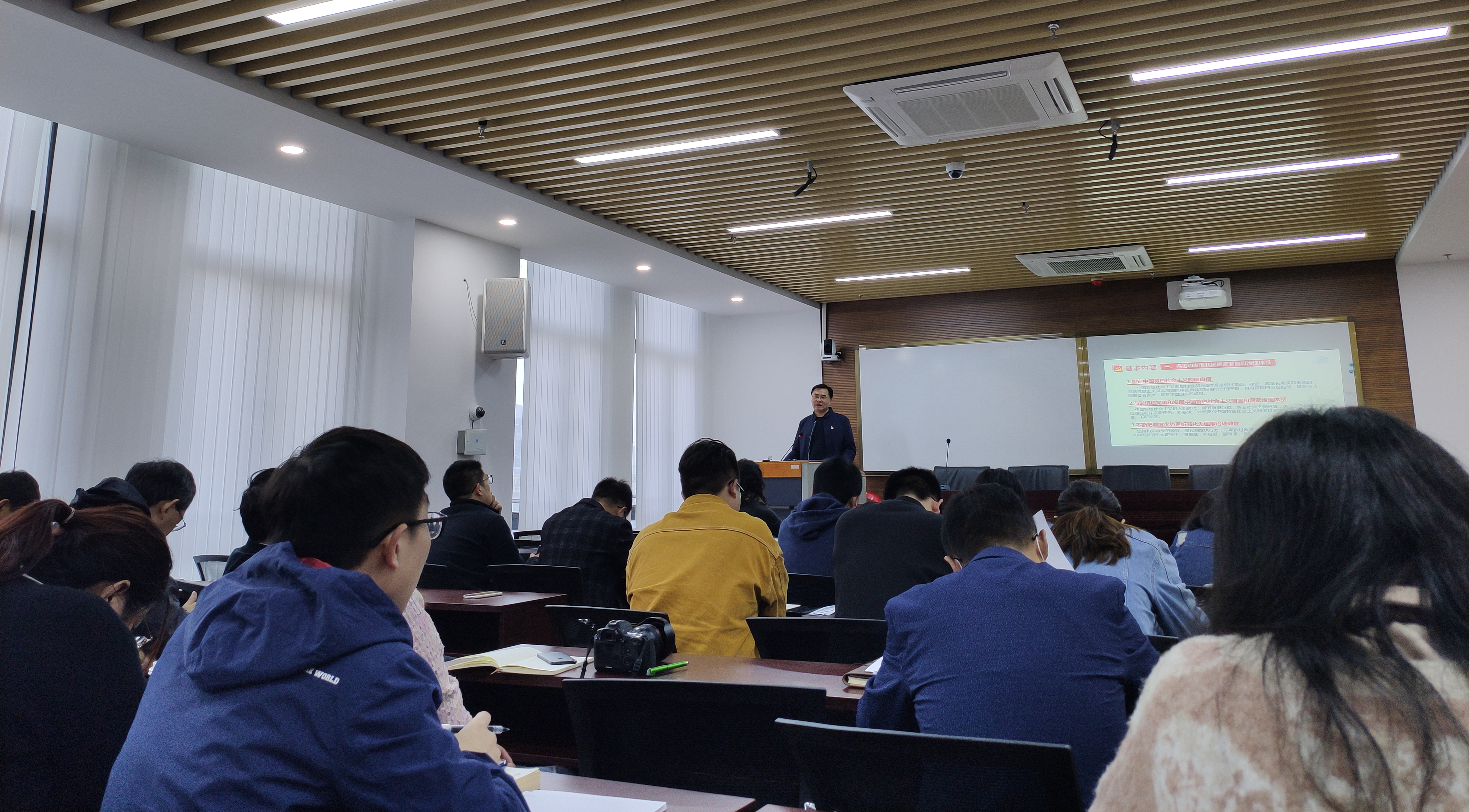 报告后,姜海作发言总结并对学院师生学习《习近平谈治国理政》第三卷提出建议与要求:要与个人科学研究、专业实践结合起来学;要与课程教学、学生培养结合起来学;要与个人修养提升、素质锤炼结合起来学。