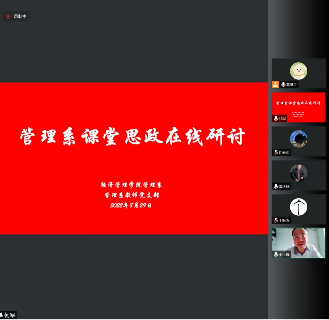 2022年8月29日下午,det365登录网站主页管理系“课堂思政主题研讨会”在线举办,本次活动同时也是管理系教师党支部以“党建教学双融合”开展支部活动,发挥党支部战斗堡垒工作的重要体现。会议由管理系系主任何军教授主持,周曙东教授、陈超教授、常向阳教授、葛继红教授等20余位老师参加了研讨会。