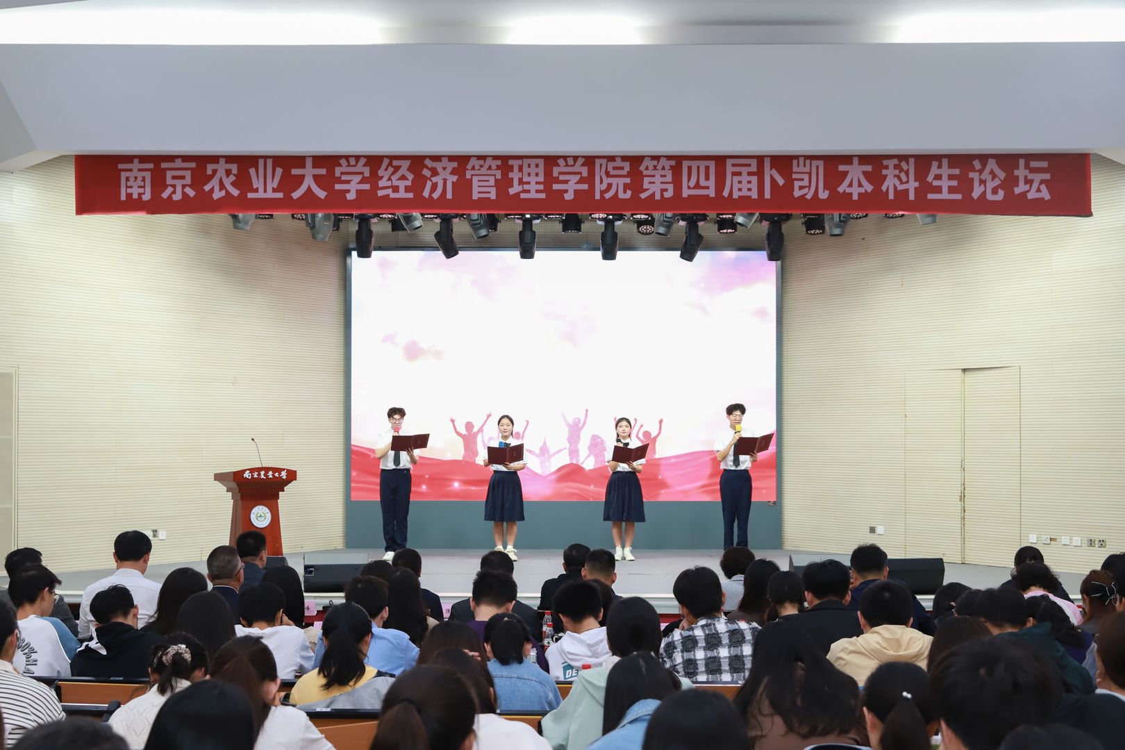 2023年10月28日上午,det365登录网站主页第四届卜凯本科生论坛在卫岗校区大学生活动中心举办。校党委副书记刘营军、党委宣传部、学生工作部(处)、校友总会办公室、研究生院等职能部门领导,东南大学、南京航空航天大学、南京理工大学、中国药科大学、南京师范大学、南京林业大学和南京财经大学等兄弟高校相关学院党委副书记,江苏农垦农发股份有限公司、江苏省邮政公司、江苏国泰华盛实业有限公司等共建单位代表和det365登录网站主页党委负责同志出席本次论坛。det365登录网站主页2023级全体本科生和兄弟高校相关学院团委书记、辅导员共计300余人参加活动。