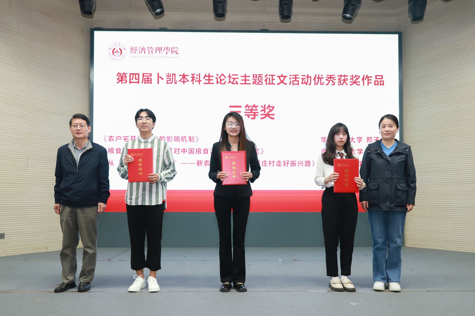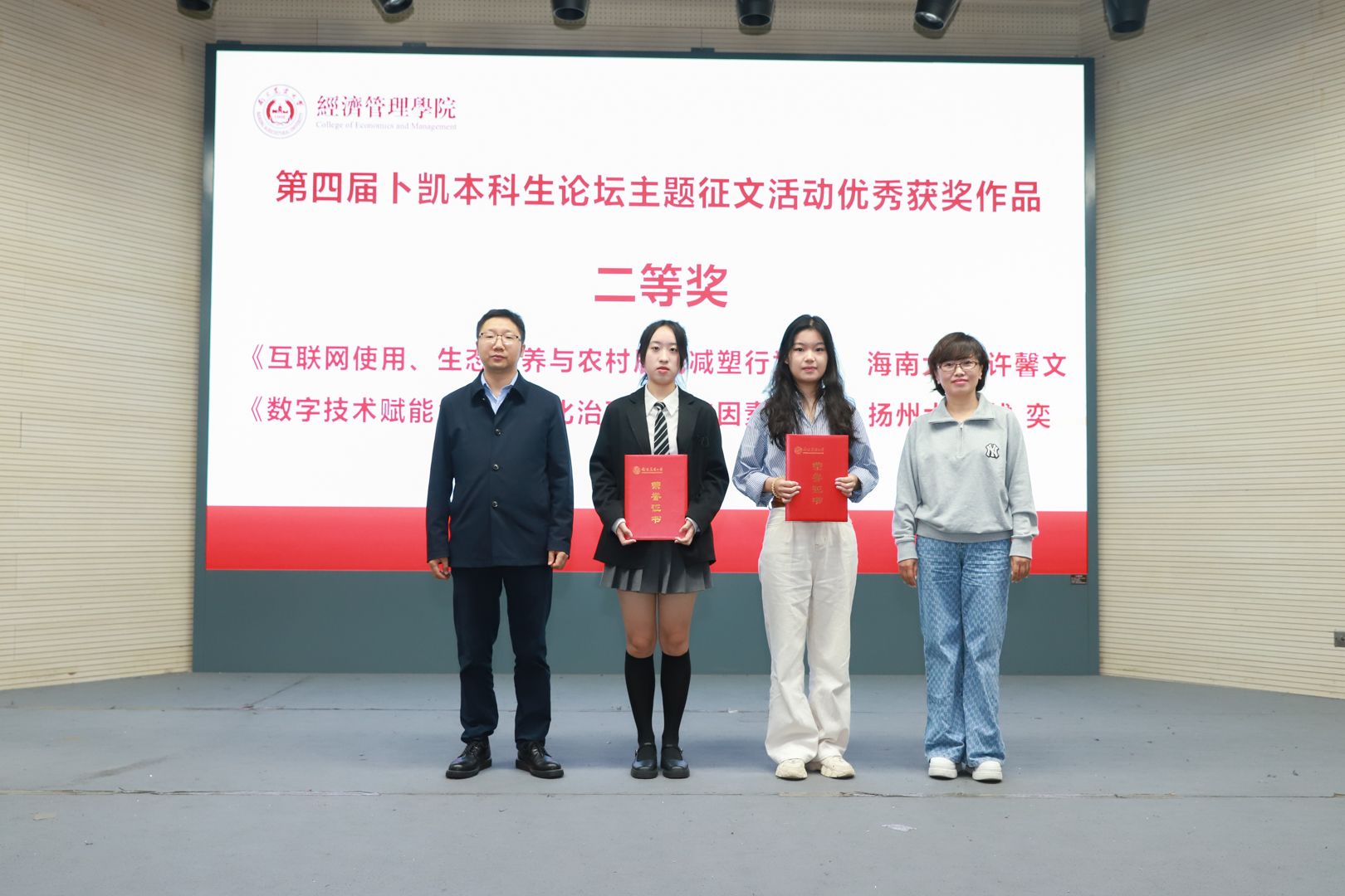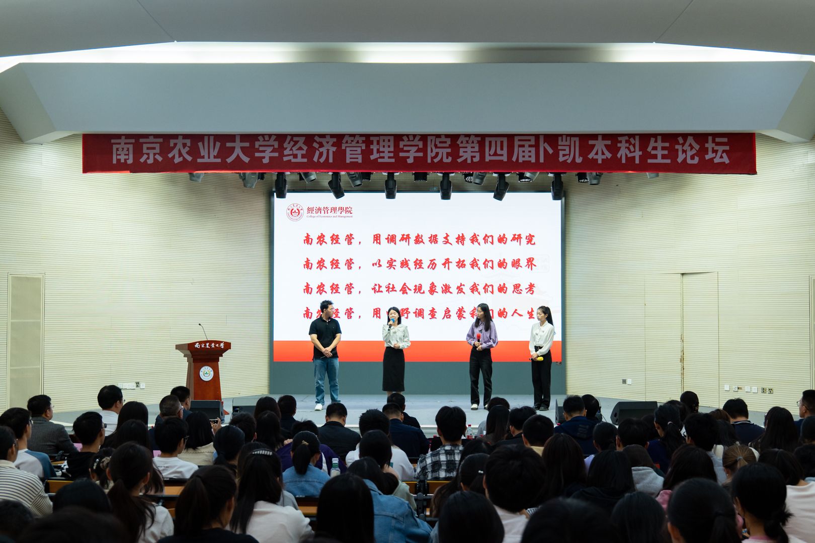 在校生代表李嘉雯与det365官网“95后”青年校友雷馨圆、王猛、支晓旭在现场展开对话交流。校友们回顾了母校时光,分享了调查实践和学术研究的经验,勉励青年学生要传承南农经管院深入农村开展调查研究的学科传统,为全面推进乡村振兴贡献蓬勃青春力量。