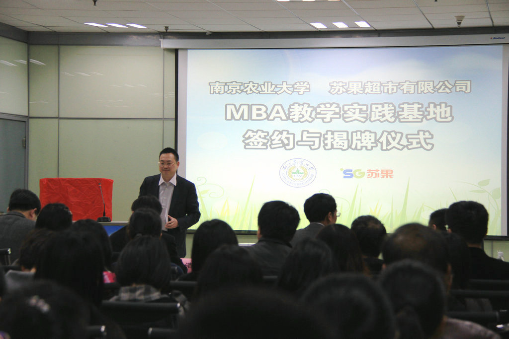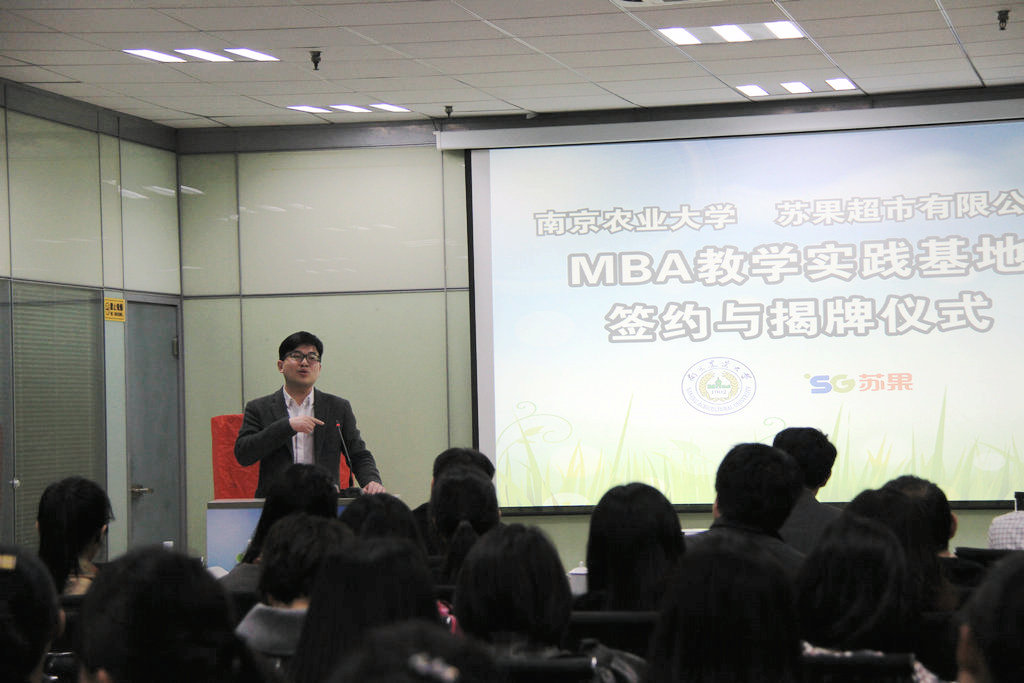 随后,苏果超市股份有限公司张永明副总经理介绍了苏果超市有限公司的基本情况,表示苏果集团在快速发展的过程中,深刻体会到“人”的重要性,实践基地的建立为苏果日后引进高端人才和创新企业管理理念提供了有利的条件,将会极大地促进苏果的发展。他希望det365登录网站主页的师资力量能为苏果的发展提供人才保障和智力支持,同时表示将创造良好的环境,对实践基地的建设提供支持。张总希望通过本次合作,让南农大MBA走进苏果、了解苏果,锻炼学员们认识与解决实际问题的能力。