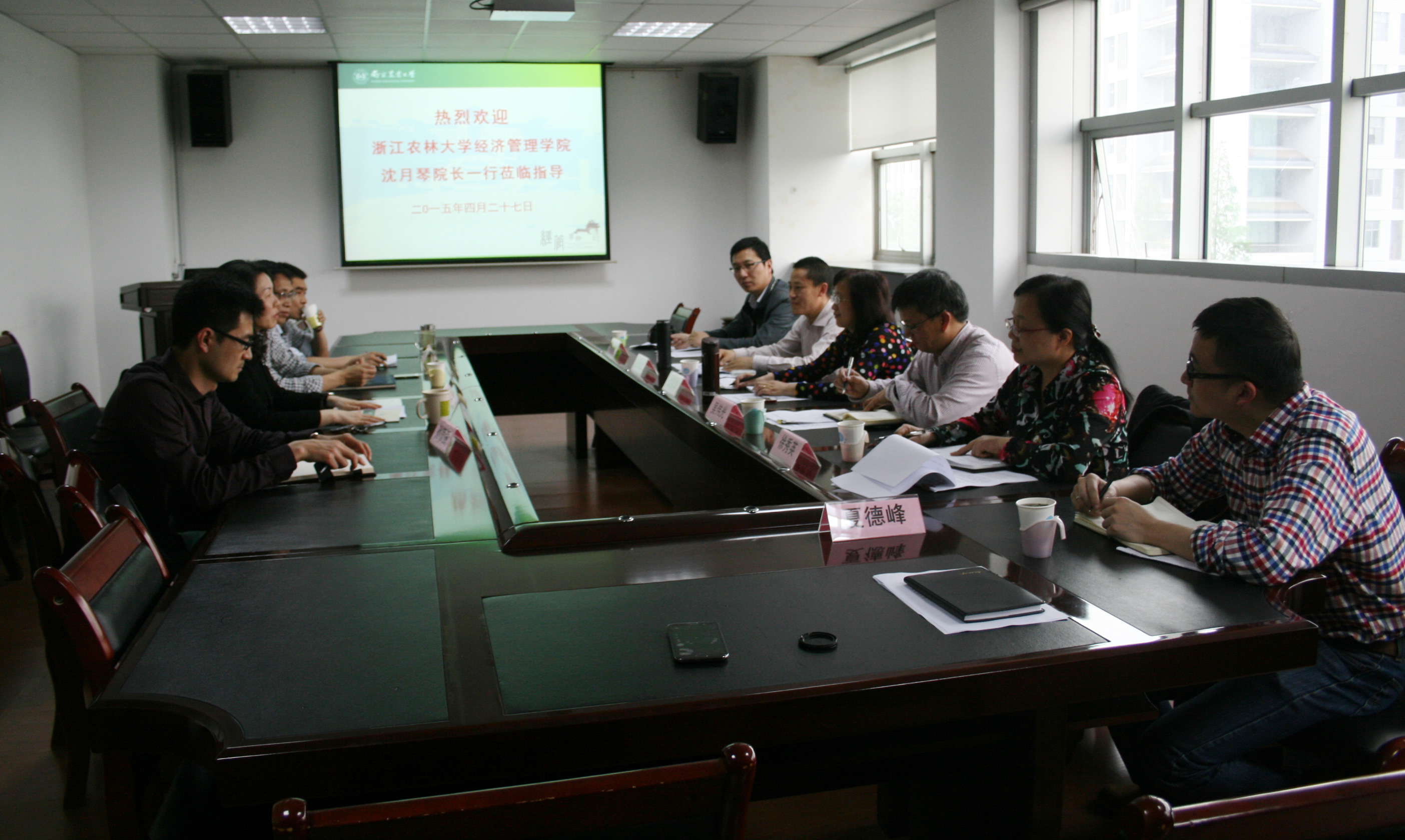 2015年4月27日,浙江农林大学经管学院院长沈月琴、副院长吴伟光、陈劲松等一行6人来det365官网考察交流。学院院长朱晶、副院长应瑞瑶、耿献辉,孙顶强副教授等参加了交流会。
