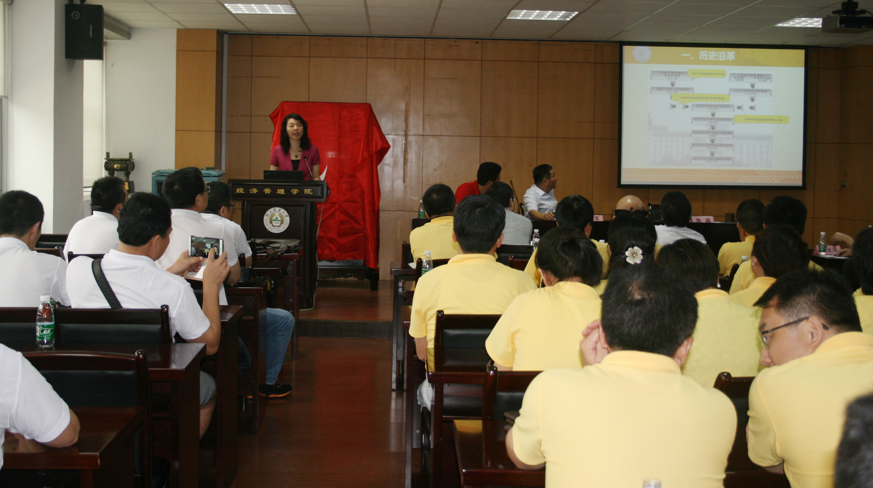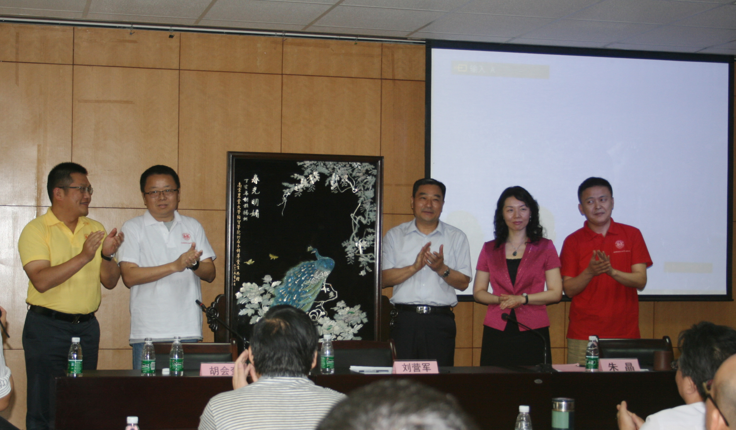 接下来,各个专业毕业校友代表分别上台发言。外贸班毕业校友代表上台以“昨天·今天·明天”为主题描绘了对母校的美好回忆,传递出对母院、母校的感激之情;金融班毕业校友代表用沉甸甸、响当当、亮闪闪三个词形容南农四年教书育人的沉甸甸、南农名声口碑的响当当以及南农成就以及未来的亮闪闪,同时用一句“若有同学在心头,南农便是好时节”表达出对母院、母校的思念之情;经管班毕业校友代表以自己幼时、少时、青年时在南农的成长、生活经历描绘在南农的深情往事,并代表95届毕业校友表达对母院、母校的衷心祝福。座谈会上,95届毕业校友代表向母院、母校赠送了《春光明媚》屏风留念。