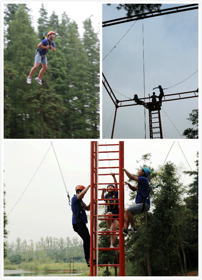 在2天的训练过程中,学员们进行了丰富的室内、室外拓展活动。天女散花项目每次由三名学员站到8米高空不足1平方的方形平台上,面对面,手拉手向后仰,同时松开双手视作挑战成功,既考验了学员直面挑战的勇气,也引导学员思考相互协作的重要性。