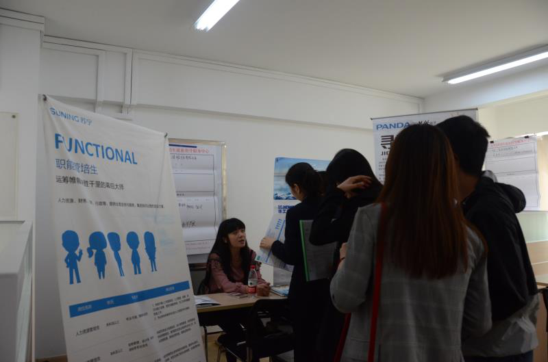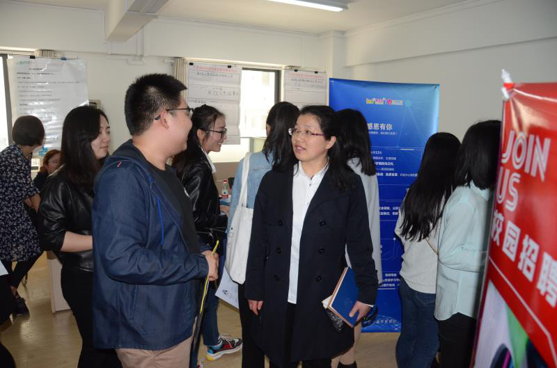 招聘单位通过树立展板、现场讲解、发放宣传单等方式向应聘者详细介绍公司规模、岗位职责、任职要求、职员薪资及福利待遇等信息。应聘者从岗位发展空间、工作时间、实习期食宿等方面提出疑问,招聘单位对这些问题一一进行了解答。同时,招聘单位通过现场面试考察了应聘者的专业相关度,以及学习、英语、沟通表达等相关能力。此外,本次招聘会还吸引了许多低年级的同学前往。