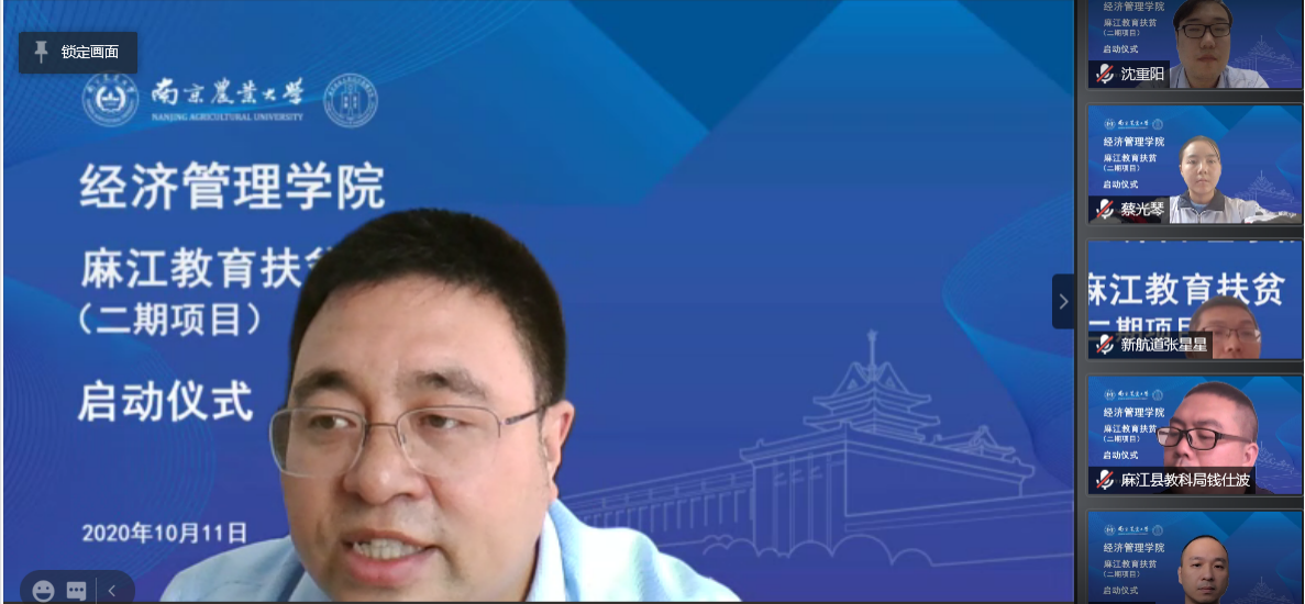 2020年10月11日,det365登录网站主页、麻江县委、麻江教科局、新航道教育集团举行了“六次方”教育扶贫(二期项目)线上启动仪式,麻江县县委常委、副县长李玉清、麻江县教科局党组成员、副局长钱仕波、麻江县教科局党组成员、县教师培训中心主任陈绍举主任、新航道教育集团南京分校校长沈重阳、南农经管院党委副书记宋俊峰、南农经管院教授经贸党支部书记周力教授参会并做了主旨发言。