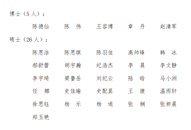 根据《关于做好2023届优秀毕业研究生评选工作的通知》,经自主申请、公开答辩、学院评审,拟推荐以下5名博士、26名硕士为2023届优秀毕业研究生。