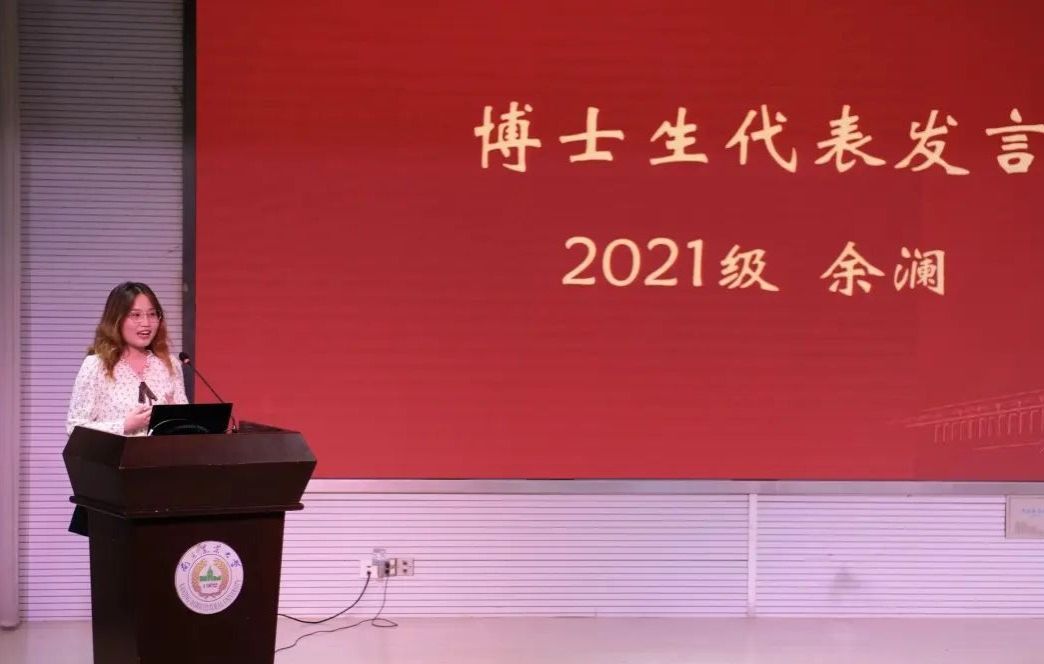 2021级国际贸易博士生余澜作为老生代表发言,分享了自己在南农求学的五年的经验:勤于思考,善于合作,新环境中多沟通交流奋力前行,勇于实践,坚定目标往前走;道阻且长,行则将至,结果与过程同等重要。最后祝福全体新生尽自己最大的热情去追逐梦想,在南农经管书写新的崭新篇章。