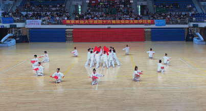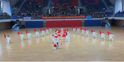 det365官网代表队作为第一支参赛队伍入场,队员们身着一袭白衣,头扎丝带,手握红扇,排着整齐的队伍井然入场。标准的太极招式、整齐划一的动作、不断变换的队形,更有羽扇张开时那扣人心弦“啪”的一声,无不展现出队员们的翩翩风采。