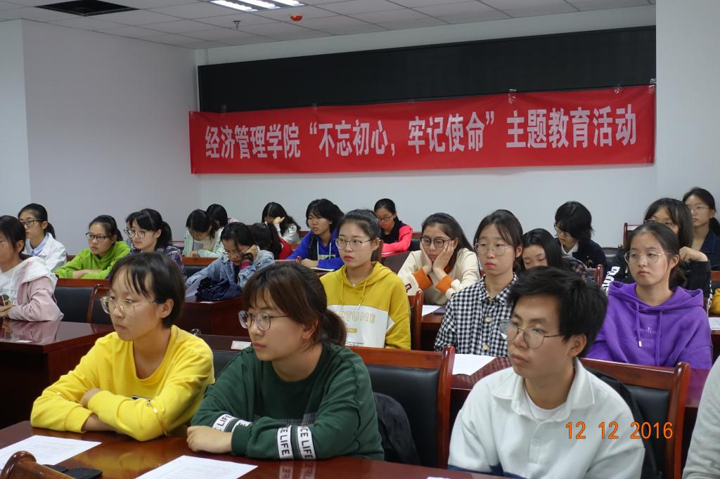 顾焕章教授从det365登录网站主页院史讲起,通过回顾全国农经学科的学术带头人刘崧生先生的事迹,深情并茂地向同学们介绍了经管院自成立以来的历史,分享了自己参与教育的初心和在南农大经管院的教学经历,深刻阐述了几代农经人为之奋斗终身的工匠精神。顾教授展现的南农人“诚朴勤仁”的精神令同学们感到钦佩不已,现场掌声不断。